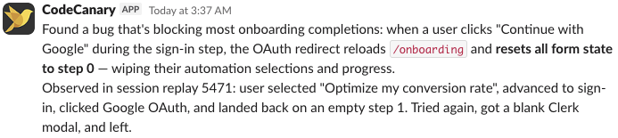 CodeCanary watches all session replays for bugs using an LLM, which lets it spot bugs before we even knew about it.